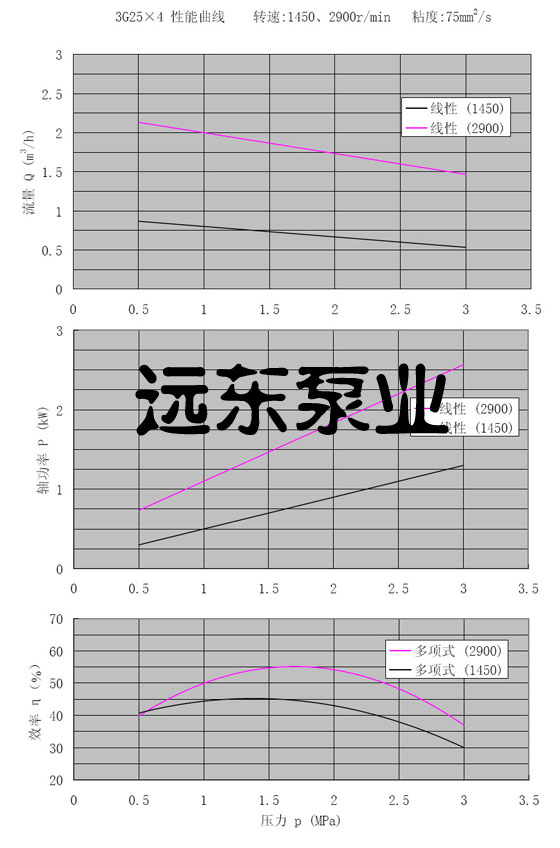 | 3GR25*4三螺杆(gan)泵轉速1450,2900r/min,粘度(dù)75cst性能曲線圖(tú) | ||||||